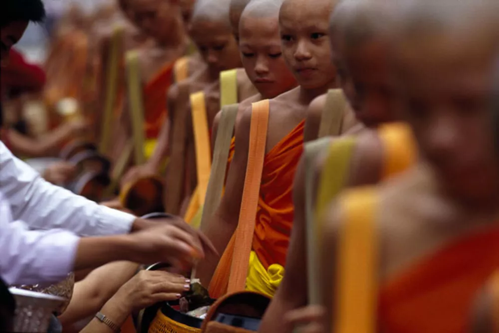 Una lunga fila di monaci avvolti in sai arancioni cammina nella foresta laotiana dandoci le spalle, soltanto uno di loro si volta e ci guarda, è un ragazzino di appena dodici anni, cerca il nostro sguardo e ci invita al viaggio.