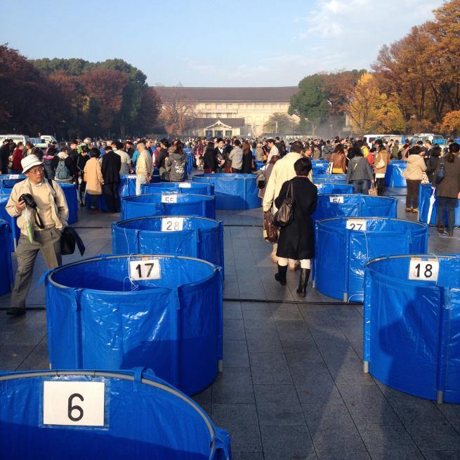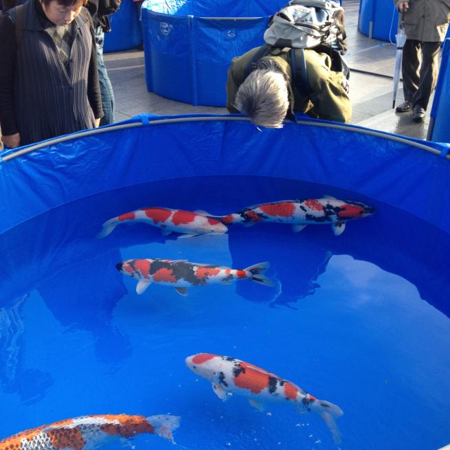 Una domenica mattina, nel piazzale principale al centro del Parco Ueno ho visto allineati una cinquantina di recipienti circolari in tela blu plastificata. Dentro ognuno di essi nuotavano delle enormi carpe colorate a chiazze aranciani, gialle e bianche. Una folla silenziosa e ammirata, di adulti e bambini, osservava dall’alto le evoluzioni dei pesci, le fotografava e segnava su dei foglietti il numero corrispondente alla vasca. Si trattava di una gara di bellezza (e soprattutto: di robustezza) di carpe. Poco distanti delle variopinte bancherelle servivano cartocci fumanti di pesce fritto e patate dolci. Era inevitabile che sorgesse, nella mia mente malata, il sospetto che le carpe che non avevano suparato la prima selezione…