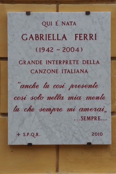 Esco dal mercato e mi avvio verso Piazza di Santa Maria Liberatrice. La piazza è affollatissima, davanti al Teatro Vittoria c’è una scolaresca in attesa della matinée. Da queste parti è nata Gabriella Ferri. Mentre cerco il palazzo, mi affiora un ricordo della mia infanzia, mio padre che suonava la chitarra e cantava: “Anche tu così presente / così solo nella mia mente / tu che sempre mi amerai”, la faccia di lui affondata in una piega trasognata, le sue spalle curve, gli occhi chiusi. Sono gli stessi versi che trovo incisi poco più in là, sulla targa al piano rialzato di un palazzo dell’Ottocento, sotto all’intestazione: “Qui è nata Gabriella Ferri, grande interprete della canzone italiana”. Così vado avanti ancora per un attimo a riflettere su quella cosa che diceva Thoreau: “Il tempo è soltanto il fiume dove vado pescando”.
