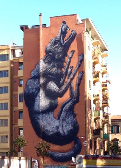 Dunque lascio la macchina nel parcheggio della Città dell’Altra Economia, al Campo Boario dell’ex mattatoio, dove negli anni Novanta, negli spazi occupati dal Villaggio Globale, ho passato anch’io sprazzi di tonante giovinezza. È una gelida mattina di dicembre, il sole basso scaglia una luce gialla e affilata sulle strade. Roma d’inverno è di un’incantevole goffaggine. La prima cosa che voglio visitare è il mercato nuovo di via Galvani che ha preso il posto dello storico mercato di piazza Testaccio. Entro dalla parte di via Franklin. Da lontano intravedo il Jumping Wolf realizzato dallo street-artist belga Roa, un murales di trenta metri raffigurante un lupo che salta e azzanna e che copre l’intera facciata di un condominio di sei piani. È una cruda rivelazione urbana, il sorcio, come lo chiamano da queste parti per via della magrezza ferina che lo rende infidamente simile a uno smisurato topo di chiavica.