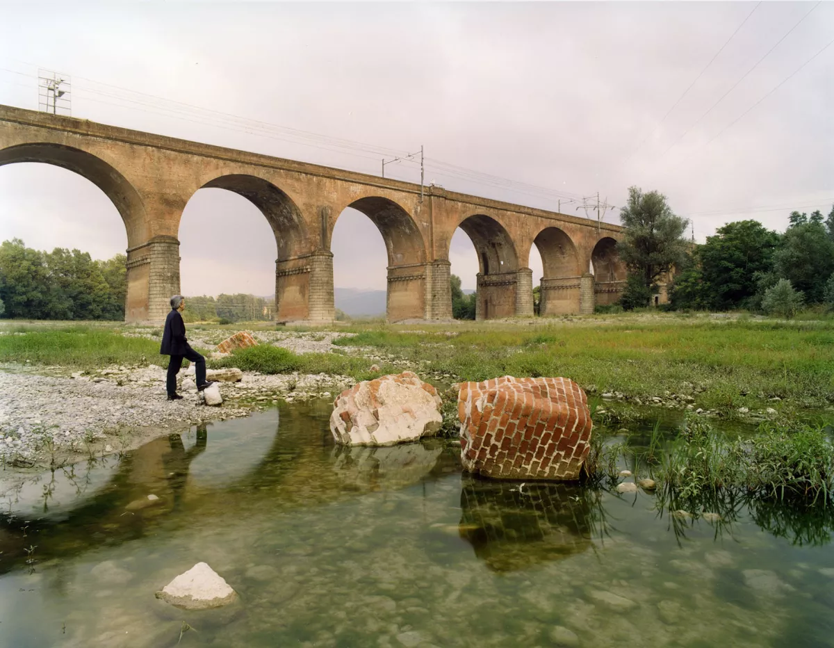 Il viaggio attraversa la vita di Fossati. Un viaggio nella pianura della provincia italiana e oltre, come nella serie Dove sono i Pirenei. Così la mostra accompagna lo spettatore alla scoperta dei territori che non hanno particolari qualità. Non ci sono monumenti, non ci sono chiese, necropoli, templi, semmai le fotografie rappresentano il nostro vivere contemporaneo, mediocre, umile, a volte silenzioso di spazi piatti delimitati dalla linea dell’orizzonte che separa il cielo dalla terra, a volte coltivata, attraversata da un torrente o da una strada. Si nota nella fotografia fossatiana una insaziabile curiosità nel leggere il paesaggio, come si legge una frase nel libro. Questo avviene nello Scrivia, un torrente che si fa fiume solo con le piene alluvionali. C’è un’immagine che ritrae l’amico artista Mario Fallini appoggiato con una gamba sul rudere di un pezzo di ponte in mattoni, che subito evoca un frammento di un monumento, essendo nei pressi dell’antica città romana di Libarna.