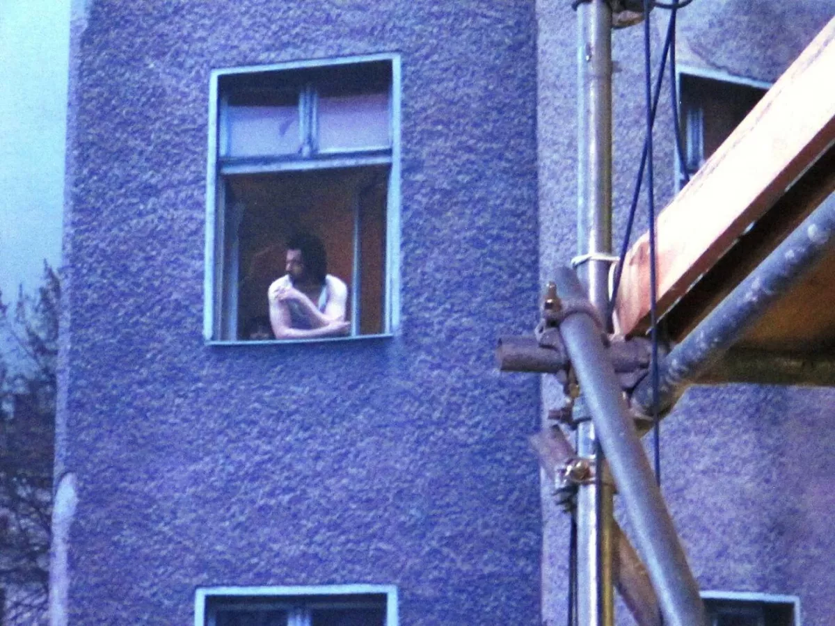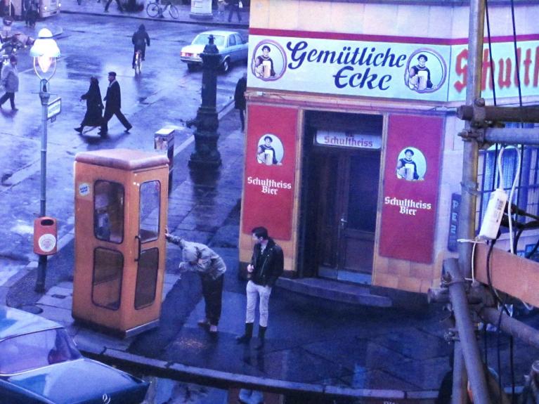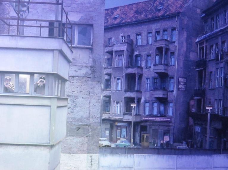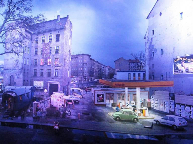 L’osservatore è libero di iniziare la sua osservazione dal settore che più lo colpisce, e procedere nella visita a suo piacimento. Vediamo, e possiamo quasi toccare con mano nella nostra postazione occidentale, un insediamento hippy di caravan, punk con creste di capelli variopinti (citazione del mitologico Club di Kreuzberg SO 36), una casa occupata dagli squatter, un mini zoo per bambini, un chiosco per la vendita del Currywurst, una stazione di servizio con il simbolo tedesco occidentale per antonomasia, il maggiolino Volkswagen, il grande manifesto pubblicitario delle sigarette Camel, un giovane che vomita a ridosso di una cabina telefonica all’uscita da una Kneipe in cui aveva bevuto troppo, turisti scanzonati in posa a ridosso del muro, negozi e attività di ordinaria portata lungo i marciapiedi.