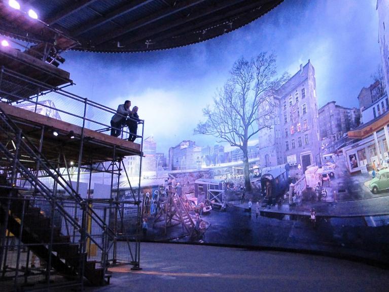 La colonna sonora riprende rumori di fondo, dai lavori in corso per la presunta ristrutturazione del palazzo, al traffico, alle voci dei passanti combinandoli con brandelli di discorsi politici d’epoca: Adenauer, Ulbricht, Kennedy, Willy Brandt, Honecker. La fruizione totale dell’opera è subordinata alla comprensione della lingua in cui parlano i relatori, il tedesco (eccezion fatta per il discorso del presidente Kennedy), anche se il registro e il tono degli interventi, indipendentemente dalla loro semantica, riesce a essere eloquente ed efficace anche per chi non abbia famigliarità con quell’idioma. Ogni dieci-quindici minuti la luce si abbassa, musica e rumori tacciono all’improvviso, e la notte scende su quella realtà segnalando il passare delle ore. Come in certi casinò di Las Vegas, verrebbe da pensare. Ma con quale differenza in effetti. Ribadisco, segnalando il passare delle ore, non simulandolo. Qui il gioco non è illudere che si stia vivendo una realtà autentica attraverso la sua rappresentazione. Non si tende a far credere al turista che non avesse conosciuto la Berlino divisa dal muro che con la visita a questo simulacro sia possibile fare ammenda e che l’esperienza (emozione) vissuta nel panometro possa equivalere all’originale. Qui si invita a ragionare, a interpretare, a trarre ispirazioni e idee per approfondire, indagare, magari anche obiettare. A viaggiare nel tempo attraverso le immagini. Metafora e non metonimia. Quanto si vede non è la fine dell’esperienza ma l’inizio, sempre che il visitatore sia un autentico viaggiatore e non un banale turista. L’abbassarsi della luce e della musica all’interno del panometro ha il valore di una citazione, di un rimando a una passata variante di illusorietà ma, al contempo, offre la consapevolezza di vivere in un regime scopico e comportamentale differente in cui anche la morale ha assunto connotazioni e modalità espressive ben diverse. Quelle dettate dalla politica comprese. Qui protagonista assoluto è lo sguardo, più che l’immedesimazione o il gioco di compenetrazione con quello spazio. Si deve restare consapevoli di stare vivendo un’esperienza visuale, a fianco degli apparati tecnologici, degli altri visitatori, i cui sguardi sul panorama e su di noi che lo osserviamo, vanno valutati come fondamentali perché la pratica sia vissuta nel suo aspetto più completo. Dobbiamo percepire anche i possibili sguardi di chi ci osserva dalle finestre riprodotte sul pannello, quelli mediati dai dispositivi ottici, macchina fotografica o binocolo dei soldati appostati sulla torretta, non per entrare illusoriamente più a fondo nella realtà fittizia ma per cogliere consapevolmente ogni sfumatura della sua struttura compositiva grazie allo sguardo straniato che riusciamo a mettere in atto, come sostenuto quasi un secolo fa da Viktor Šklovskij nelle sue teorizzazioni sul formalismo russo: