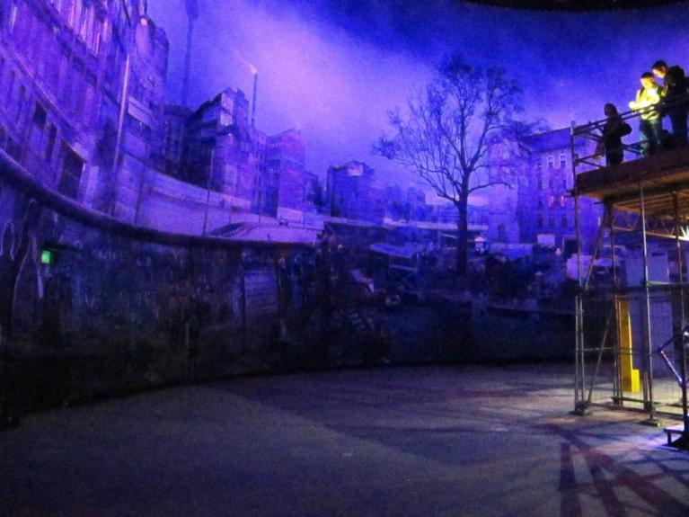 Se ci si spinge poco oltre il caos dell’isolato che ospita quel che resta del Check Point Charlie, fondamentale e fatidico punto di passaggio tra l’est e l’ovest nella Berlino divisa, se si supera la striscia di cubetti di porfido che segna sull’asfalto il vecchio tracciato del muro, se si costeggiano innumerevoli pullman turistici parcheggiati in attesa dei turisti in visita, si raggiunge un padiglione inelegante, a suo modo monumentale, ma non fine a sé stesso e che raccoglie un piccolo grande gioiello: il panorama di Yadegar Asisi che proprio al muro è stato dedicato. Asisi è un artista di origine iraniana, nato a Vienna nel 1955, che ha realizzato svariati Panorami dedicati a realtà geo-culturali di epoche diverse. Panometro dice l’autore del complesso che ospita la sua opera, riprendendo e facendo performare il concetto di panorama nel senso che Benjamin, Kafka, Brod e Kracauer hanno contribuito a trasmettere. “La visibilità cambia modo e gli enunciati cambiano regime”, come scriveva Deleuze. Non si tratta della vecchia struttura a giostra, resa immortale da Walter Benjamin, davanti alla quale si prendeva posto appoggiando gli occhi a una fessura e attendendo lo scorrere di esotiche immagini stereoscopiche, ma di un grande diorama ospitato in una costruzione che esternamente ricorda un gasometro. Entrando ci si trova in un territorio ibrido, non ancora mondo della visione ma piuttosto soglia che prepara all’impatto: mostre fotografiche in tema con il discorso relativo a muro, libertà, sue violazioni. E spazi per la libera espressione del pensiero: pareti e pavimenti su cui scrivere, disegnare, lasciare e condividere commenti ispirati a quanto appena sperimentato nel cammino verso il diorama vero e proprio. E il percorso riprende antiche strategie e sensazioni, non superate neppure per lo spettatore contemporaneo, uso a visioni pluridimensionali ma disabituato alla struttura del diorama.