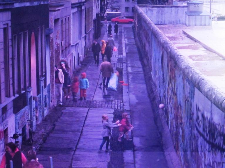 Manca l’effetto shock del cinema, ma per il visitatore può iniziare, per dirla ancora con il Benjamin di molti anni fa, “l’ebbrezza di perdersi in un tempo fatto di immagini” e, volendo, di “riflettere con rigore sul particolare pathos che è riposto nell’arte dei panorami. Sul suo particolare rapporto con la natura, ma anche, e soprattutto, con la storia”. Il primo segnale per chi osserva sta nell’apparente indifferenza delle persone effigiate nei confronti di quelle due barriere parallele che per decenni divisero la città. La realtà di ogni giorno si sviluppa aggirando l’ostacolo, ignorandolo o, in alcuni casi, coinvolgendolo nella propria esistenza e risemantizzandolo, come fanno i bambini che giocano a palla lanciandola proprio contro quella grigia parete. Analoga funzione esercita l’uomo che, armato di pennelli e colori, istoria la facciata che si affaccia a occidente con graffiti colorati. Forme che accostano decostruzione e rimozione psicologica di uno scomodo e detestato intoppo che troppe limitazioni imponeva allo svolgimento della vita anche nella sua più ordinaria forma quotidiana.