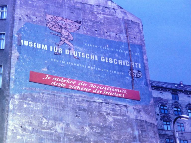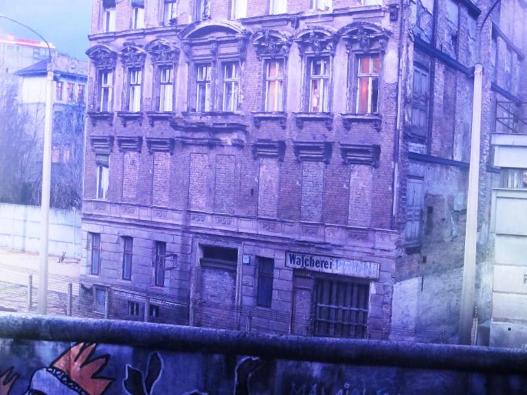 E nella parte orientale, al di là della livida barriera, eleganti modanature architettoniche d’epoca erose dal tempo e dall’incuria sulla facciata di un palazzo, l’immancabile torre della televisione, eretta su Alexanderplatz in modo che incombesse su tutta la città a dispetto delle frontiere, pareti di edifici con le finestre del primo piano murate, nessun cartellone pubblicitario ma con un eloquente slogan propagandistico, “Più solido è il socialismo, più sicura è la pace”, non a caso piazzato dall’artista sotto uno sbiadito affresco che segnala il museo di storia tedesca.