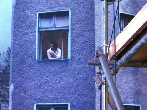 Nessun pedone da quel lato, vista l’inquadratura che nasconde la parte bassa di vie e marciapiedi, come oscurata dal famigerato divisorio, ma anche come se, e qui si esprime la mia perplessità, nel settore orientale non esistesse una vita quotidiana, inficiata sicuramente dalle note difficoltà e vessazioni, ma non per questo assente o meno godibile di quella d’oltre frontiera. Dietro una finestra chiusa nella grande casa del settore orientale una figura infantile osserva quanto accade all’esterno, suggerendo che soltanto una fruizione passiva dell’esistenza fosse possibile per chi viveva all’est, metafora della vita da reclusi che toccava ai residenti di quella porzione di città. Nel mezzo la violenza delle fotoelettriche che inondavano di luce accecante la zona interposta tra i due corsi della barriera, il binocolo puntato del soldato all’interno della torretta, la terra di nessuno, i residui di neve su un terreno dove non può passare anima viva. Suolo sottratto alla vita e sacrificato alla violenza e alla morte.