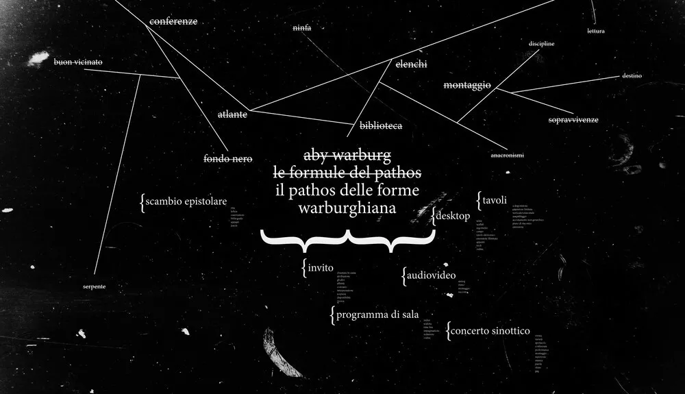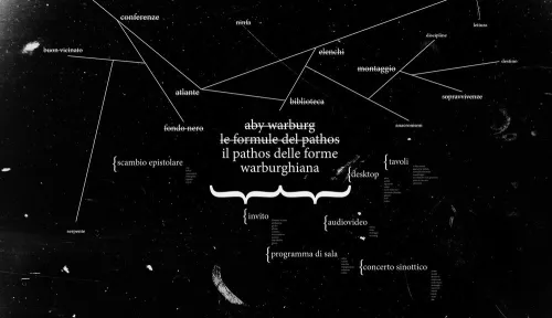 Da un lato mettiamo l’Atlante Mnemosyne e la Biblioteca di Aby Warburg, ci mettiamo il fondo nero su cui si stagliano le figure dell’Atlante e il criterio di “buon vicinato” della disposizione dei libri nella biblioteca; e ancora le conferenze che erano ben più che attività didattica, la diversità delle discipline che Warburg pretendeva di coinvolgere e di montare, gli elenchi che redigeva con valore quasi autonomo; ci mettiamo poi le figure della ninfa e del serpente, e quella del destino infine (“Prova pure ciò che vuoi con le tue vele, io ti prendo per il ciuffo!”), che danno sostanza anche esistenziale alle sopravvivenze che teorizzava.
