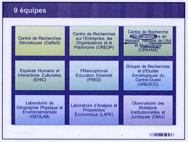 Ogni singolo gruppo di ricerca è contrassegnato da una sigla, così come ogni corso di laurea o master, dipartimento o istituto, facoltà e università e ufficio ministeriale, come anche gli assi di ricerca, i tipi di progetto, le classi di obiettivi e via farneticando. Credo d’aver capito che il punto di partenza per misurare l’IDR siano le norme dell’AERES, che deve render conto all’OPECST, avendo presenti le istanze dei JPI e delle COST, senza disattendere le norme ISO. Il Comitato di cui facevo parte avrebbe dovuto esaminare il lavoro di nove gruppi di ricerca, alcuni dei quali bi-site, facenti parte dell’IR SHS: CERES, EHIC, OMIJ, LAPE, GRESCO, CREOP, CRIHAM, FRED, GEOLAB, UMR CNRS.