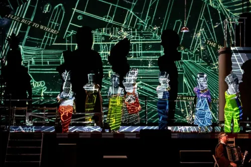 The Great Yes, The Great No di Wiliam Kentridge ha chiuso il 68.esimo Festival dei Due Mondi di Spoleto diretto da Monique Veaute. A raccontarlo così, per frammenti di testo, si coglie solo una parte di uno spettacolo complesso, che si rispecchia nella mostra dedicata all’artista sudafricano a palazzo Collicola. Vari piani ritraggono il cargo: in basso è situata una piccola orchestra, che allarga la sua gamma di suoni usando la voce, nuda e attraverso le vibrazioni metalliche di rudimentali megafoni. Su una striscia lunga di palco, rappresentante il ponte della nave, agisce uno straordinario ensemble vocale di sette donne dalla gamma vocale che spazia dall’impostazione lirica a quella del canto etnico. Dà vita al coro e ai personaggi dell’opera, quelli citati ma anche Aimè Césaire e la moglie Suzanne, Jean e Paulette Nardal, che con Leopold Sédar Senghor fondarono il movimento anticolonialista della Négritude nella Parigi del primo dopoguerra. Appaiono, con l’uso di fotografie di volti usati come maschere, Frantz Fanon, il profeta della rivoluzione algerina, Joséphine Bonaparte e Joséphine Baker, la famosa ballerina che fu spia per la Resistenza, e perfino Trotskij, con le sue idee sulla libertà rivoluzionaria dell’arte, e un deforme Stalin repressore. Su quel livello si erge una plancia, pronta a ruotare e a trasformarsi in cabina, per momenti più intimi di riflessione. Alle spalle fa da fondale il disegno di una nave piena di sartie e fumaioli, un’immagine proiettata che può mutarsi in armate naziste che marciano, in salottieri uomini-caffettiera, in uccelli che intonano un coro di pigolii, versi, canti e in molto altro.