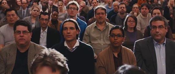 Un uomo diventato ricchissimo derubando migliaia di persone ricomincia da dove è partito, dando lezioni su come si convincono gli altri a comprare, su come ci si distingue dalla massa diventando ricchi. Siamo alla fine degli anni ’90, il decennio della fine della Storia, poco prima del settembre 2001, quando la Storia è ricominciata. Perché la Storia è sempre pronta a ricominciare, e la società americana a riprendere la sola corsa che per lei abbia senso, quella verso la ricchezza. Il movimento di macchina è lo stesso: il dolly si alza su una folla seduta e si mette in movimento. Solo non va indietro, ma avanti; e il protagonista non è nella folla, ma davanti a essa.