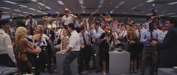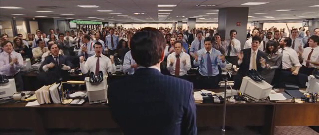 Scorsese riprende l’orgia di quel cammino, ne fa la sua unica regola, e non concede alle sue bestie nemmeno il privilegio della tragedia. I broker di Wall Street sono infatti l’evoluzione dei mafiosi di Casinò, che finivano la loro corsa al passaggio tra i ’70 e gli ’80, travolti dall’inevitabile avanzare delle truppe di casalinghe all’assalto. I gangster però erano una nicchia, spazzatura che si prendeva il benessere a morsi, mentre i lupi sono fottuti capitani Achab che insegnano alle masse a cacciare balene; terroristi telefonici che convincono migliaia di famiglie avide come loro ad aprire le loro tasche; bambini nella fabbrica del cioccolato pronti ad azzuffarsi il più possibile.
