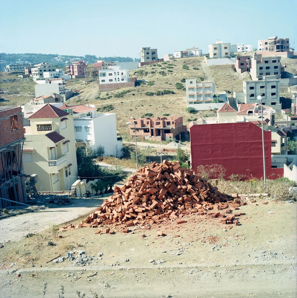 Barrada, che ha studiato storia e scienza politiche alla Sorbona, osserva il proprio paese da una strana lontananza: i soggetti dei suoi scatti colmano il campo visivo, assumendo non di rado aspetti monumentali, anche quando si tratta di edifici e giardini affetti da precoce obsolescenza, perché abbandonati all’incuria; di frammenti di industrializzazione in disuso, oppure di cantieri per infrastrutture interrotte ancor prima di iniziare e mai completate. Le immagini di Barrada restituiscono un mondo che si sbriciola, attraversato da sentieri che si interrompono improvvisamente: sembra di muoversi sulle tracce lasciate da individui incapaci di portare a compimento spinte volitive tanto quanto progetti condivisi. Il territorio e le sue trasformazioni diventano metafora della colonizzazione e della sua crisi.