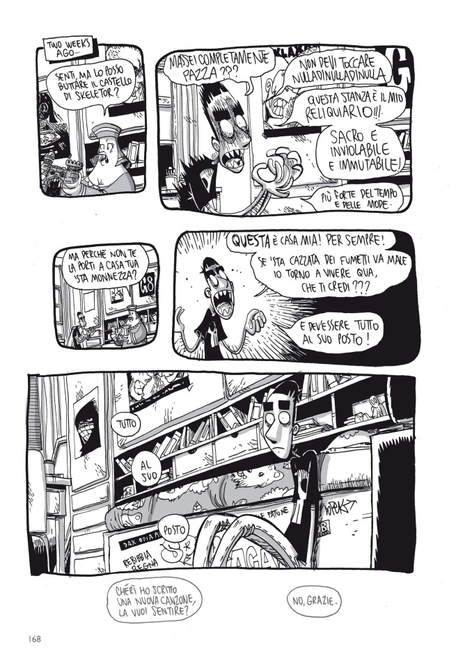 Uno schema che sembra destinato a ripetersi sempre uguale, ma che resta quasi sotto traccia, a fare da scenario alle avventure del protagonista e dell’alter ego Armadillo, degli amici di sempre Secco e Cinghiale, e degli adulti (i genitori separati, gli anziani vicini di casa). E sono avventure raccontate di volata, con tempi comici precisi e rapidissimi, saltando da un riferimento all’altro, serio e meno serio (dal CTRL+Z all’anoressia, dai mercatini indie al G8), giocando con gli stereotipi del mainstream e di quello che un tempo si chiamava underground, e prendendo a piene mani da stili e generi diversi. La madre con le fattezze di Lady Cocca di Robin Hood e i ritratti dei parenti che pescano da Disney, la mimica, gli occhioni e le linee di movimento dei manga anni Novanta (come Ranma e DragonBall), la contaminazione tra generi e l’ironia nera con cui giocava già molto fumetto indipendente (Brian the Brain, per esempio, di Miguel Ángel Martín).