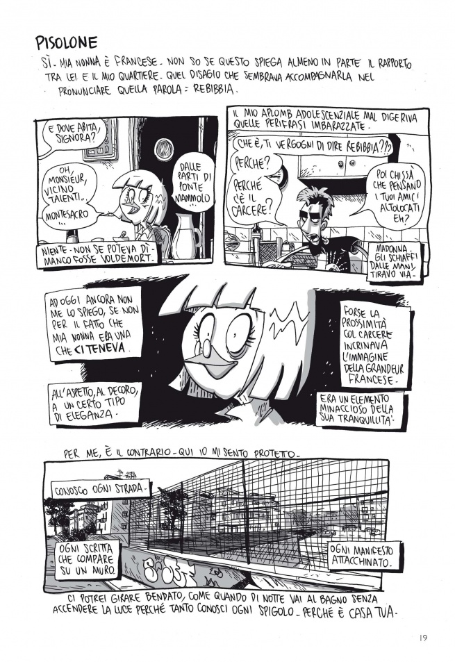 L’obiettivo non è il reportage – la fotografia, esatta e distaccata, di quello che si vede, vista con l’occhio di chi descrive e non partecipa. L’obiettivo è fare di Rebibbia un generatore di storie. Come Topolinia, come la Bologna di Pazienza – un luogo che comunica molto più dei suoi muri o delle vicende che la attraversano, ma che ci restituisce anche qualcosa di noi che guardiamo. Ed ecco le maglie del quartiere ritagliare spazi e ruoli, e dare forma a figure e personaggi: i condomini tutti uguali, i bulli e i gruppuscoli a scuola, i centri sociali, i bar. E il precariato delle ripetizioni e dei lavori da casa, e delle vecchie case dei genitori sempre a disposizione.