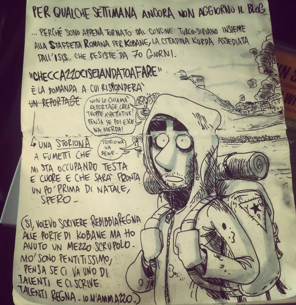 A qualche mese dall’uscita di Dimentica il mio nome, Zerocalcare si è messo a esplorare altre barriere: quelle tra il memoir e il reportage, tra il racconto di sé e il racconto della realtà. Lo ha fatto uscendo da Rebibbia, letteralmente e simbolicamente allo stesso tempo, e andando a raccontare la resistenza di Kobane all’assedio dell’Isis. «Sai perché non me ne vado mai da Rebibbia? Perché a Rebibbia mi sento al centro del mondo. Dove succedono le cose», racconta in Kobane calling, mentre cerca di capire che cosa l’abbia portato lì, a distribuire aiuti umanitari insieme alla Staffetta romana per Kobane. Per poi aggiungere, subito dopo: «Ora per la prima volta sento che il centro del mondo è qui».