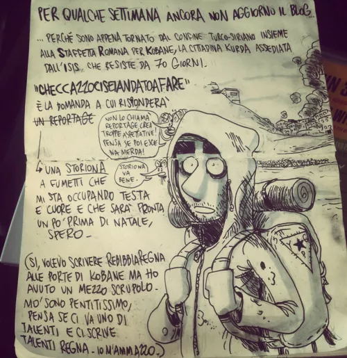 L’esperimento, in termini di vendite, è andato benissimo: Internazionale esaurito in poche ore, e Kobane calling ristampato a parte e allegato anche al numero successivo. Alcuni hanno storto il naso, sul mescolarsi di elementi di colore e di dettagli in presa diretta, di aneddoti da inviato di guerra e di armadilli. Forse però, per Zerocalcare, l’unico modo di raccontare tutto questo era proprio quello di trasportare il suo alter ego con tutto il suo bagaglio di idiosincrasie e di manie – ovvero la sua maschera, la sua buona distanza per guardare la realtà – giù a Kobane. Perché questa “storiona” (così l’ha chiamata lui stesso) non è solo un reportage disegnato su Kobane, ma è il reportage di Zerocalcare a Kobane, con tutto quello che ne consegue: quello di essere un fumetto in cui, come al solito, c’è molto da ridere e molto da riflettere, dove l’ironia non arretra di fronte a nulla, e il cui protagonista si aggira per le storie che racconta come tra i post del suo blog.